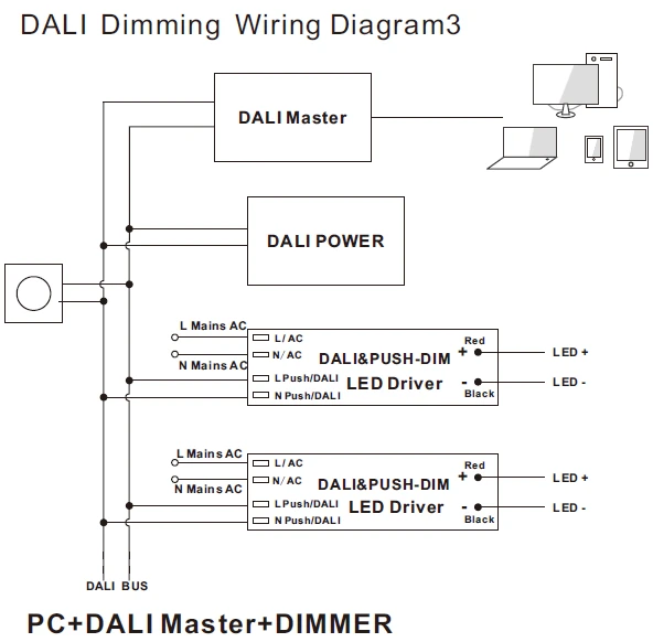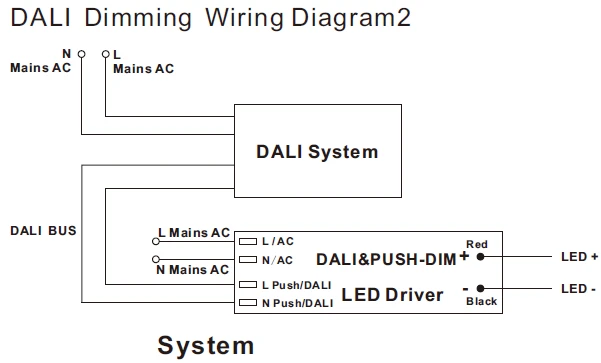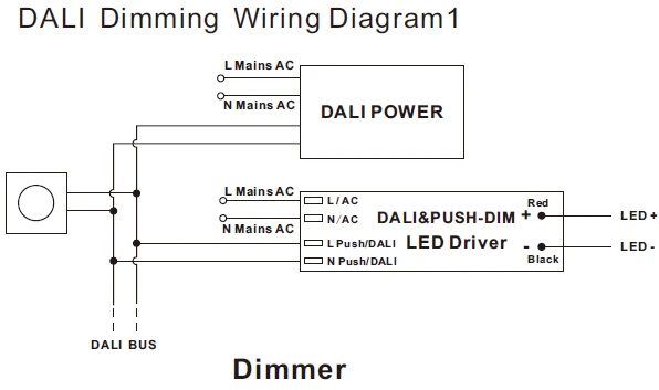 Note: For DALI Dimming Wiring Diagram 3, please noted that only one DALI power is need in the DALI bus, so no extra DALI power is needed if the Master or Dimmer already includes the DALI Power.