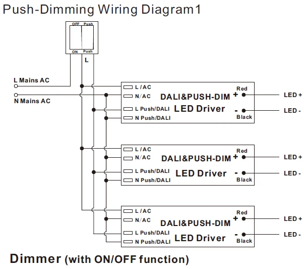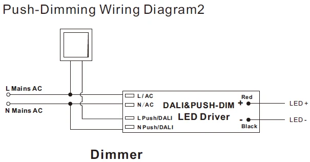 wire (N) is connected to AC (N) while and wire (L) is connected to Push dim switch dimmer( L) when use Push function.